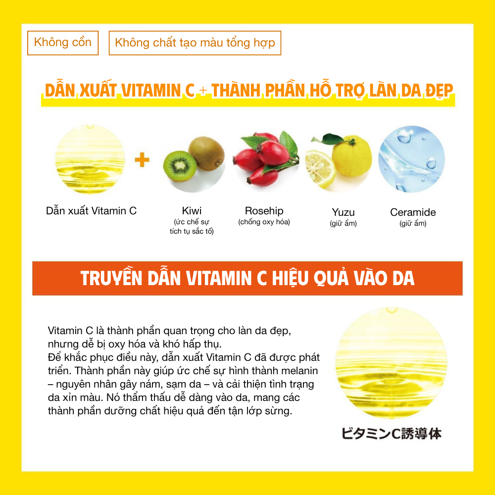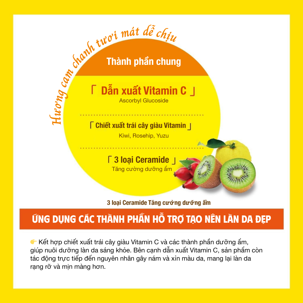 - Chiết xuất trái cây giàu Vitamin: Kiwi, Tầm xuân (Rose Hip), Yuzu – dưỡng trắng, chống oxy hóa mạnh mẽ, cấp ẩm cho da.